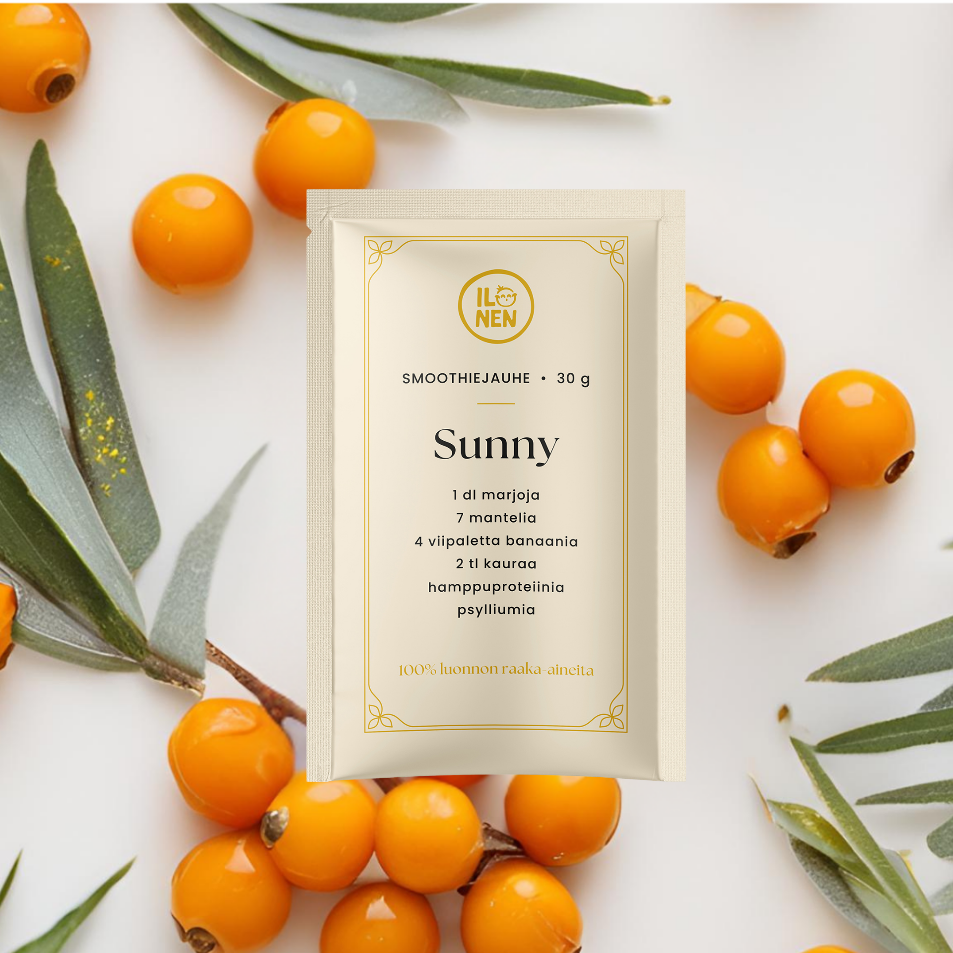 Ainesosat: Marja- ja hedelmäjauhesekoitus 36 % (pakastekuivattu tyrni- ja banaanijauhe), mantelijauhe 22 %, hamppuproteiini, gluteeniton kaurajauhe, psylliumjauhe, suola